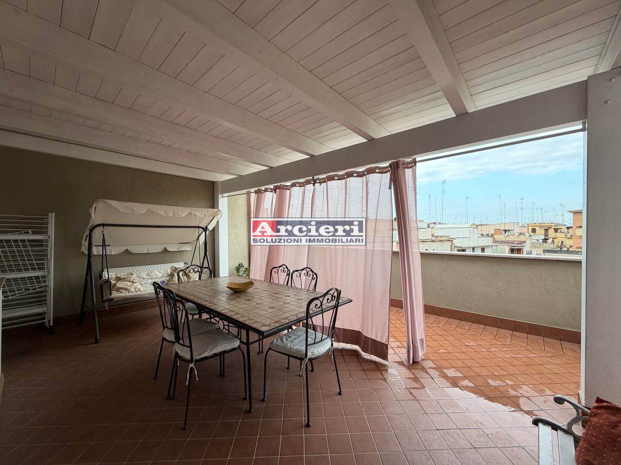 Il vero punto di forza è la splendida veranda, pavimentata e coperta da una tettoia in legno, uno spazio esterno perfetto per pranzi, relax o serate in compagnia.